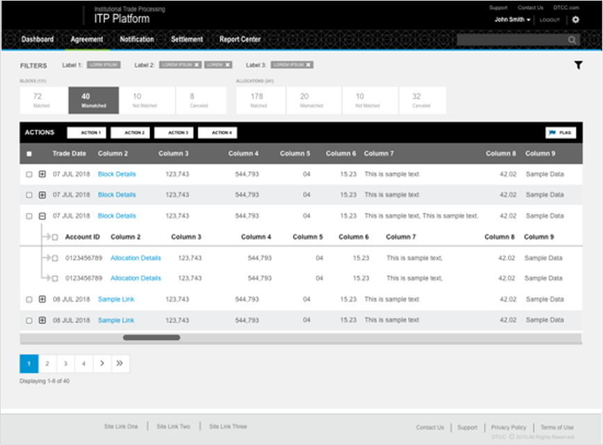 I created an initial set of wireframes based on the concepts chosen. These needed to be very detail oriented to ensure that the data was accuratly represented within the system. A big focus was on the overall lifecycle view of the data records and the landing page dashboard which would provide the user key insights into the overall outlook of the data and key actions to take to resolve any issues.